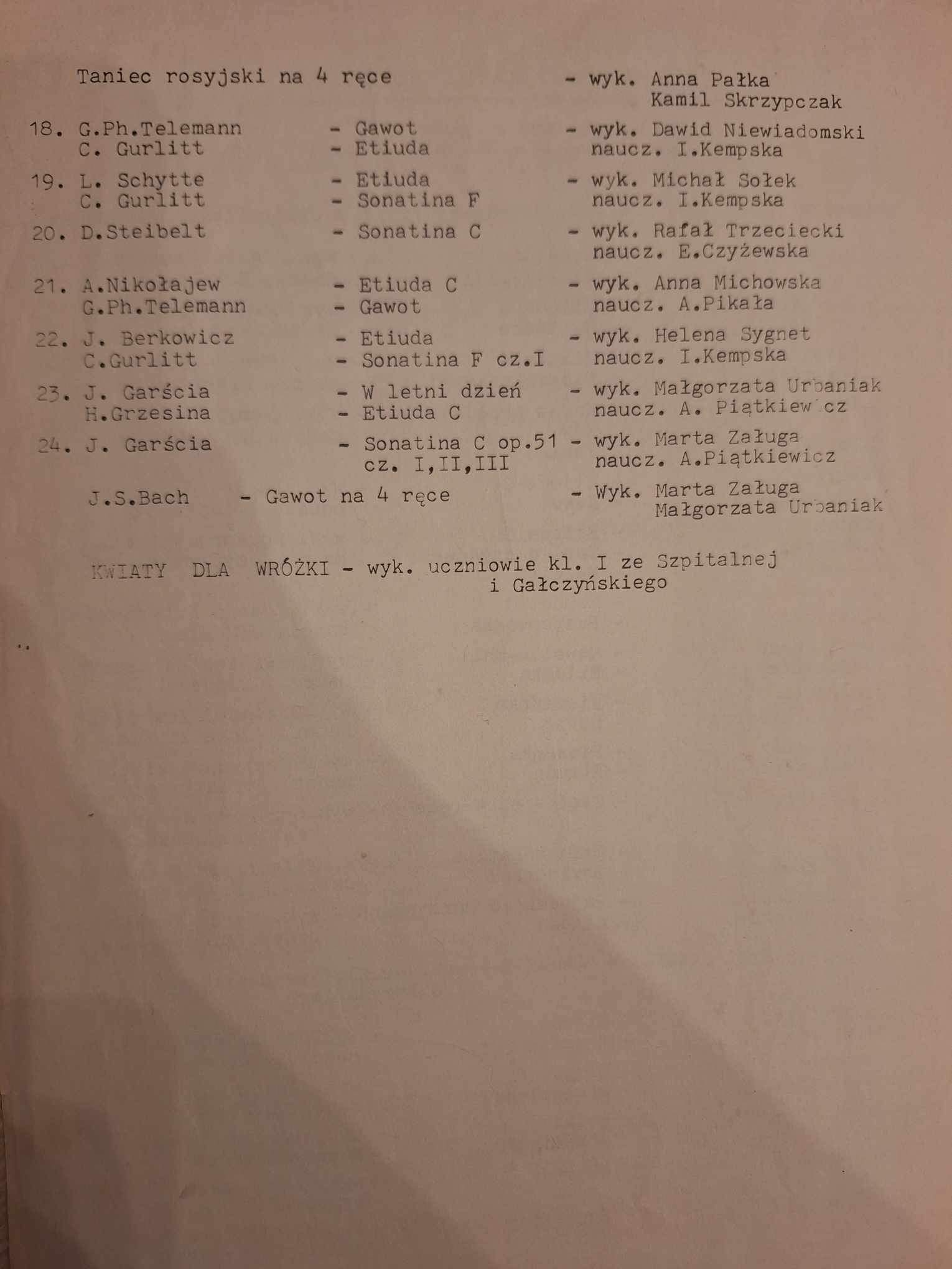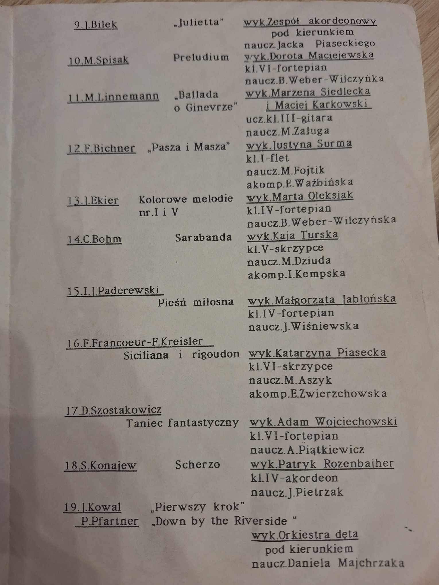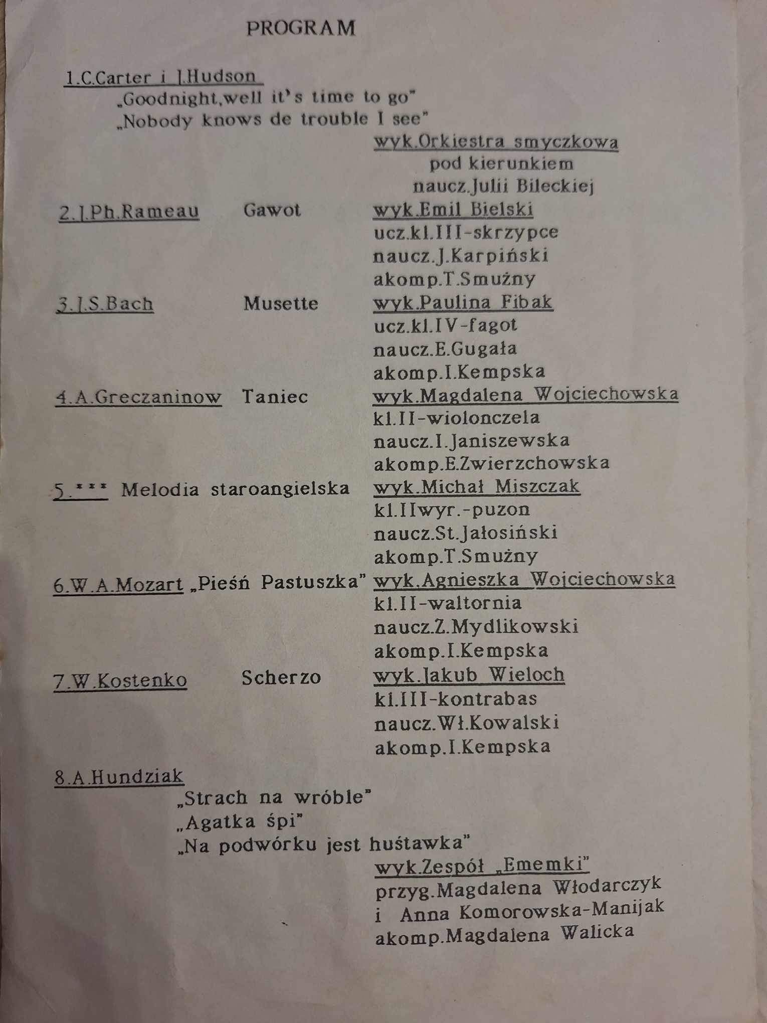 2014 Piknik szkolny 29 listopada 2015 roku – 65-lecie Szkoły 26 września 2016 roku – Wycieczka na Cmentarz Żydowski i grób Tansmana 23 października 2016 roku – NFM i Afrykarium Wrocław 7 grudnia 2016 roku – Fabryka bombek w Piotrkowie Trybunalskim 28 listopada 2018 roku – Narodowe Forum Muzyki i Panorama Racławicka 31 października 2019 – Filharmonia Łódzka – Koncert z okazji 200. rocznicy urodzin Moniuszki 8 grudnia 2019 roku – wycieczka do Hydropolis we Wrocławiu 14 października 2020 roku – Dzień Nauczyciela – Rada 12 czerwca 2021 roku – wycieczka – Zakościele i Inowłódz 25 czerwca 2021 roku – Zakończenie Roku Szkolnego listopad 2022 roku – Festiwal Muzyki Romantycznej w Skierniewicach – Jagoda Jarocka i Helena Leduchowska z nauczycielkami P. Rybińską i M. Dębowską 29 kwietnia 2022 roku – wycieczka dyplomantów 9 czerwca 2022 roku – Talent Artystyczny 24 czerwca 2022 roku – Zakończenie Roku Szkolnego 1 czerwca 2023 roku – Koncert orkiestry dętej w Parku Szarych Szeregów 24 kwietnia 2024 roku – Wycieczka dyplomantów – Teatr Narodowy w Pradze 25 kwietnia 2024 roku – Laureaci Regionalnego Konkursu Duetów Fortepian na 4 ręce w Tomaszowie Maz. wraz z nauczycielkami 28 kwietnia 2024 roku – koncert w Filharmonii 19 czerwca 2024 roku – Zakończenie Roku Szkolnego 7 grudnia 2024 roku – wycieczka do Krakowa – Opera i Muzeum lata 90-te Dzienniczki uczniowskie z ubiegłego wieku